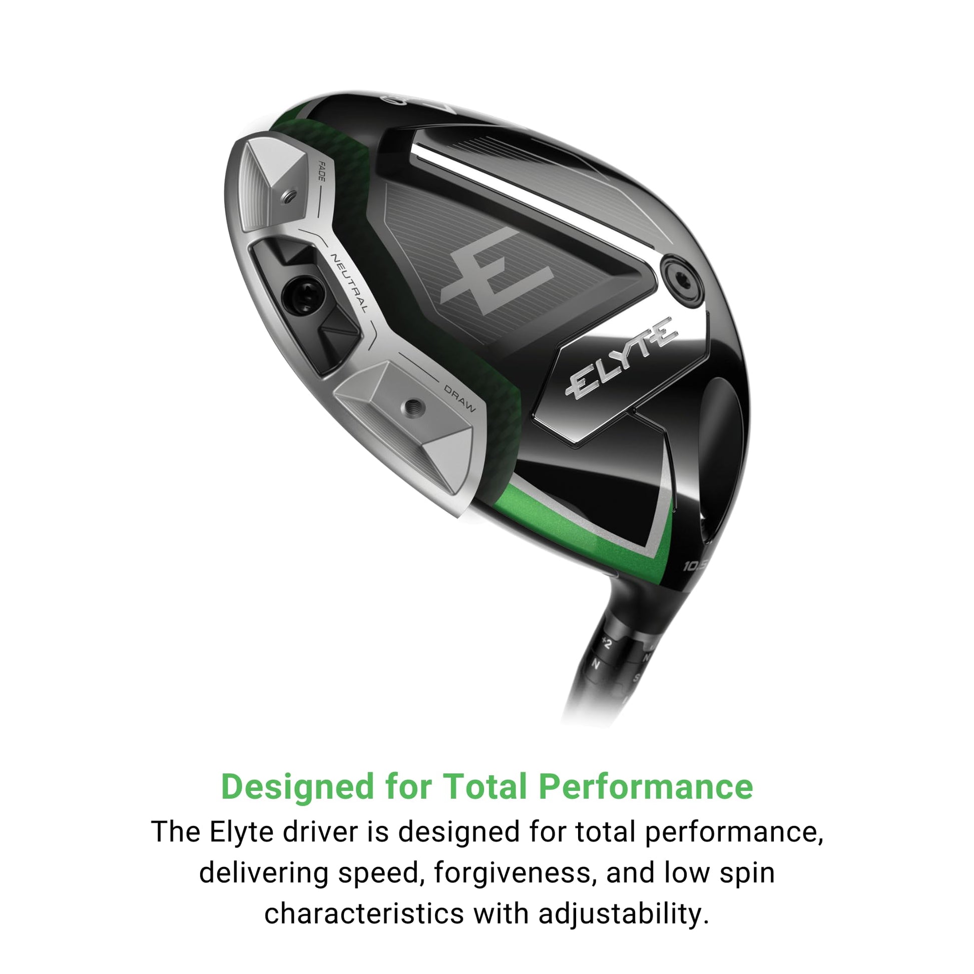 - Designed for Total Performance. The Elyte driver is designed for total performance, delivering speed, forgiveness, and low spin characteristics with adjustability. Now featuring a discrete weighting system with a 13g moveable weight to enable a neutral, draw, or fade shot shape.