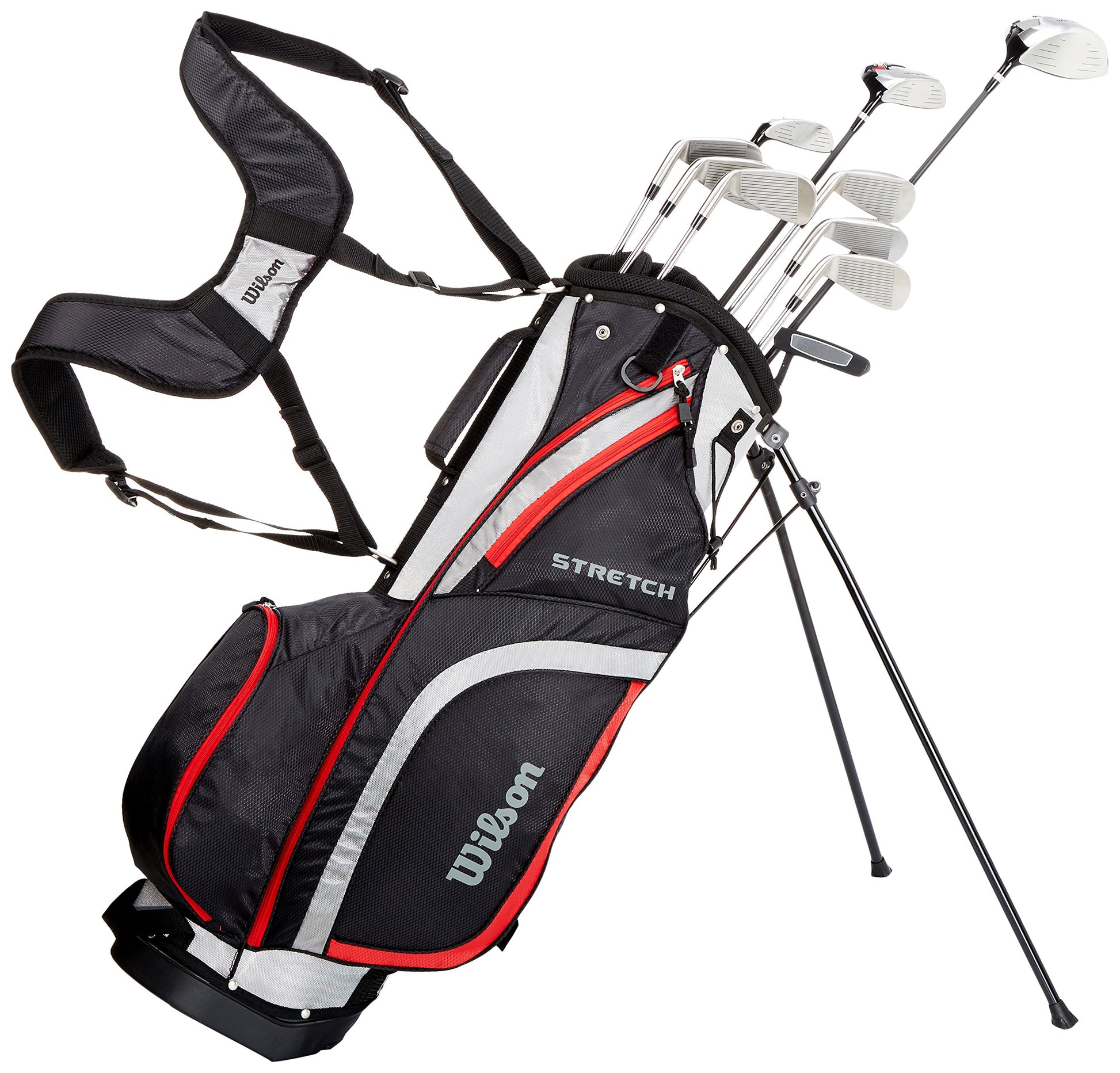- Contents: 1x Wilson Stretch XL Stand Bag with 10 golf clubs (men's right hand): Driver, 3 wood, 5 hybrid, 6, 7, 8 and 9 irons, pitching wedge, sand wedge and putter, Weight: 4.99 kg, Dimensions (LxWxH): 109 x 23 x 23 cm, Black/Grey/Red, WGG157548